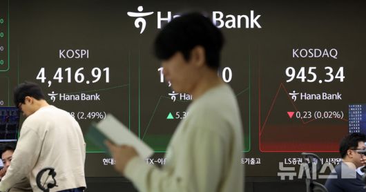 [서울=뉴시스] 이영환 기자 = 코스피가 전 거래일(4309.63) 보다 76.29포인트(1.77%) 오른 4385.92에 출발한 5일 오전 서울 중구 하나은행 딜링룸 전광판에 지수가 표시되고 있다.