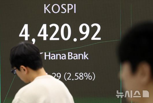 [서울=뉴시스] 이영환 기자 = 코스피가 전 거래일(4309.63) 보다 76.29포인트(1.77%) 오른 4385.92에 출발한 5일 오전 서울 중구 하나은행 딜링룸 전광판에 지수가 표시되고 있다.
