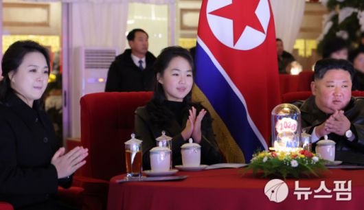 [서울=뉴스핌] 이영종 통일전문기자 = 북한 국무위원장 김정은이 지난 1일 평양 능라도 5월1일경기장에서 열린 신년 경축행사에서 부인 리설주, 딸 주애와 함께 공연을 보며 박수를 치고 있다. 주애가 치열교정 장치를 착용하고 있는 모습이 드러난다. [사진=조선의오늘] 2026.01.05 yjlee@newspim.com |