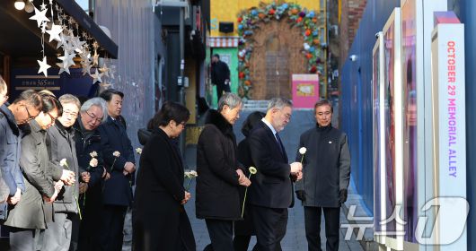 (서울=뉴스1) 오대일 기자 = 10.29이태원참사 특별조사위원회 송기춘 위원장과 특조위원들이 5일 오전 서울 용산구 이태원역 1번 출구 골목 '10.29 기억과 안전의 길'을 찾아 헌화하고 있다. 2026.1.5/뉴스1