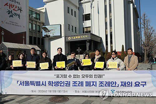 (서울=연합뉴스) 정근식 서울시교육감이 5일 서울 중구 서울시의회 본관 앞에서 학생인권 조례 폐지 조례안 재의를 요구하며 기자회견을 하고 있다. 2026.1.5 [서울시교육청 제공. 재판매 및 DB 금지]