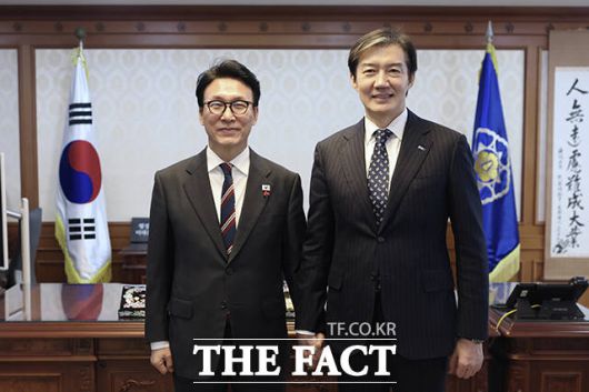 [더팩트ㅣ임영무 기자] 김민석 국무총리(왼쪽)가 5일 오전 서울 종로구 정부서울청사에서 조국 조국혁신당 대표와 면담에 앞서 기념사진을 찍고 있다.