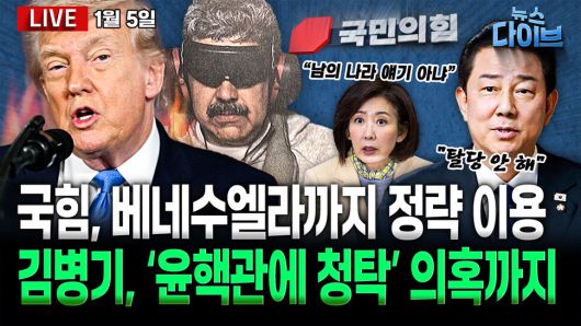 출연: 신용한 지방시대위원회 부위원장, 정구승 변호사, 이정주 CBS 기자, 진행: 고현준. 베네수엘라 침공이 “한국에 경고”?... 국힘 황당 논평 / 국힘 당직자들 오세훈 집단 공격... 한동훈 “명백한 해당 행위”/ 김병기 “제명당하더라도 탈당 안 해” / ‘공천 5번 줄 땐 언제고’ 국힘 이혜훈 비판에 박지원 “자격 있나” / 윤, 뻔뻔한 신년 메시지 “적토마처럼 일어서자”. 오늘 (1월 5일) 뉴스 다이브 많은 시청바랍니다.