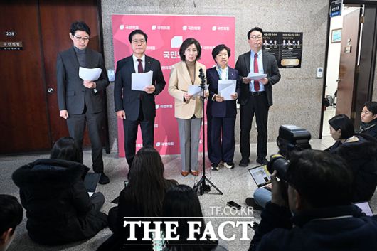 [더팩트ㅣ국회=남용희 기자] 국민의힘 법제사법위원회 소속 주진우와 송석준, 나경원, 조배숙, 곽규택 위원(왼쪽부터) 이 5일 오후 서울 여의도 국회에서 민주당의 일방적 법사위 회의 취소 통보를 규탄하고 있다.