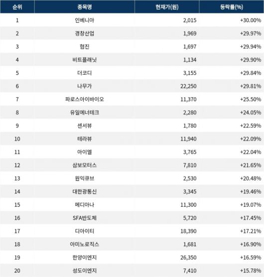 6위 나무가(190510)는 22,250원으로 29.81% 상승 마감했다. 7위 파로스아이바이오(388870)는 종가 11,370원으로 25.50% 상승 마감했다. 8위 유일에너테크(340930)는 종가 2,280원으로 24.05% 상승 마감했다. 9위 센서뷰(321370)는 1,780원으로 22.59% 상승 마감했다. 10위 테라뷰(950250)는 11,940원으로 22.09% 상승 마감했다.