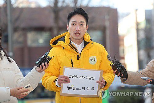 (서울=연합뉴스) 박동주 기자 = 더불어민주당에서 제명된 강선우 의원의 '공천헌금' 의혹을 공직선거법 위반 혐의로 고발한 정의당 이상욱 강서구위원장이 5일 고발인 조사를 받기 위해 서울 강서경찰서에 출석하며 발언하고 있다. 2026.1.5