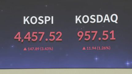 이어 4,420선을 넘었는데 오후 들어선 상승폭이 3% 이상 커지며 4,450선마저 뚫었습니다.