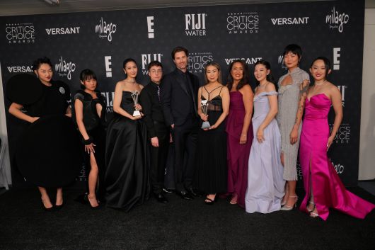 [산타모니카=AP/뉴시스] 케이팝 데몬 헌터스(케데헌)의 매기 강(오른쪽 다섯 번째) 감독과 제작진이 4일(현지 시간) 미 캘리포니아주 산타모니카의 바커 행어에서 열린 제31회 크리틱스 초이스 어워즈에서 최우수 장편 애니메이션상을 받은 후 프레스룸에서 기념 촬영을 하고 있다. ‘케데헌’은 ‘골든’으로 주제가상도 받아 2관왕에 올랐다. 2026.01.05. |