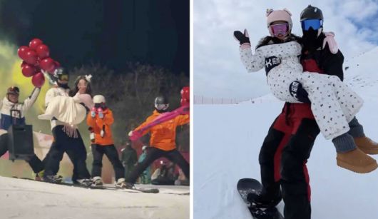 영상 속에서 강사는 그녀를 안고 슬로프를 내려오고, 자오는 빨간 풍선을 들고 미소를 지으며 강사의 어깨에 팔을 두른 모습이었다. 주변에는 다른 강사들이 축하 현수막을 들고 꽃, 케이크, 스피커, 색색의 연기를 준비해 분위기를 더했다.