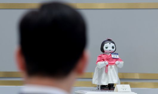이재명 대통령이 2일 청와대 영빈관에서 열린 신년 인사회에서 AI 로봇 리쿠의 새해인사 모습을 보고 있다. 연합뉴스 |