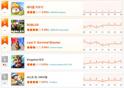 이번 주 중위권에서 가장 눈에 띄는 변화는 ‘킹샷’의 급부상이다. 지난주 7위에 머물렀던 킹샷은 4위까지 단숨에 점프하며 강한 존재감을 드러냈다. 여기에 꾸준히 상위권을 노크해온 ‘라스트 워: 서바이벌’ 역시 TOP5를 유지하며, 장기 흥행작으로서의 저력을 이어가고 있다.
