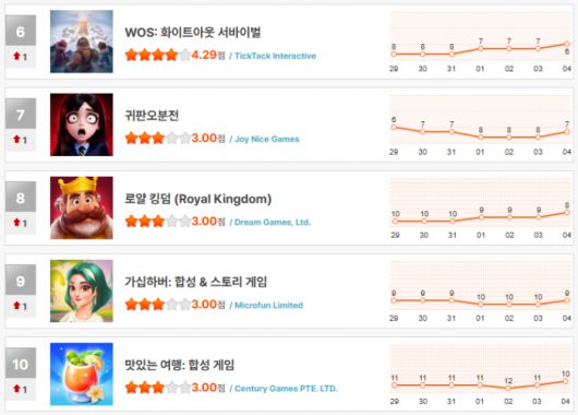‘로얄 킹덤’은 10위에서 8위로 소폭 상승했고, ‘가십하버: 합성 & 스토리 게임’ 역시 지난주 10위 턱걸이에서 9위로 한 계단 상승하며 다시 안정권에 진입했다.