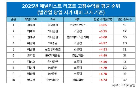 5일 AI 투자자문사 리서치알음은 한 달에 한 종목 이상 리포트를 발간한 애널리스트를 대상으로, 리포트 발간 당일 시초가 대비 고점 수익률 평균을 산출해 ‘2025년 스타 애널리스트’를 집계해 발표했다.