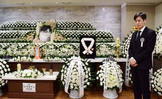 故 안성기의 아들 안다빈 작가가 5일 서울 서초구 서울성모병원에 마련된 빈소를 지키고 있다. 사진공동취재단 |