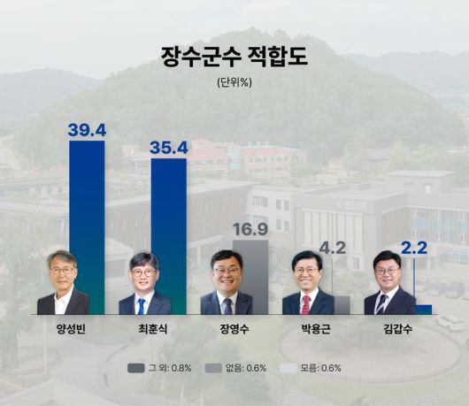 뉴시스 전북취재본부와 전북도민일보가 여론조사 전문기관 조원씨앤아이에 의뢰해 지난해 12월29~30일 이틀간 장수지역에 거주하는 만 18세 이상 남녀 503명을 대상으로 실시한 여론조사 결과 차기 장수군수 후보 적합도 조사에서 양성빈 전 도의원이 39.4%로 35.4%를 기록한 최훈식 현 군수와 4.0%p 내 오차범위 내 접전을 보였다.
