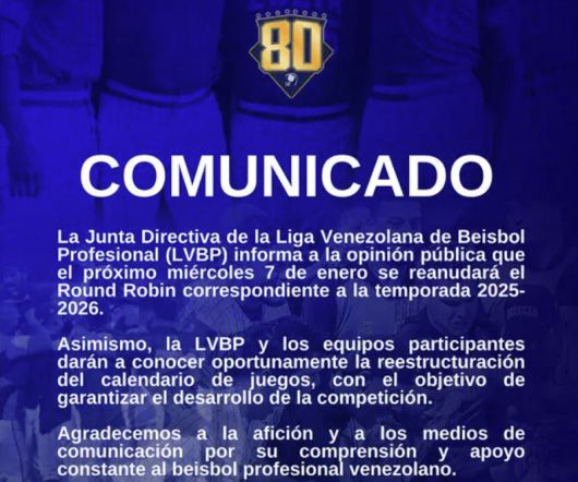 베네수엘라 야구 리그인 LVBP는 5일(한국시간) 성명서를 내고 "LVBP 이사회는 2025–2026시즌에 준결승 리그전을 오는 7일 재개한다고 대중에 알린다"며 "또한 LVBP와 참가 구단들은 대회의 원활한 진행을 보장하기 위해 경기 일정 재조정 내용을 적절한 시점에 공개할 예정이다"라고 밝혔다.
