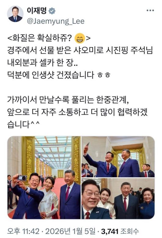 이 대통령은 “화질은 확실하쥬?”라는 제목의 게시물을 통해 사진을 공개하며 “경주에서 선물 받은 샤오미로 시진핑 주석님 내외 분과 셀카”라고 했다.