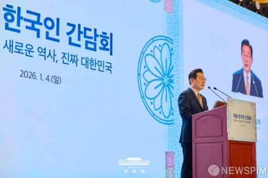 [서울=뉴스핌] 이재명 대통령이 지난 4일 중국 베이징의 한 호텔에서 열린 재중 한국인 간담회에서 인사말을 하고 있다. [사진=청와대] 2026.01.06 photo@newspim.com