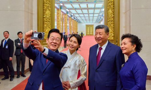 이재명 대통령이 시진핑 중국 국가주석에게 선물받은 ‘샤오미폰’을 들고 시 주석 부부와 함께 직접 기념 사진을 찍는 모습을 공개했다.