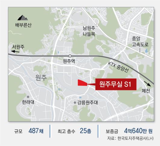지방에서도 병원이 가깝고 수도권 이동이 편리한 강원 원주시에서도 공급한다. 이번에 나온 원주무실 S1블록은 2만3800여 ㎡, 487채 규모다. 전용 60㎡ 이하 146채, 60㎡ 초과 85㎡ 이하는 341채로 나뉜다. 차량으로 20분 거리에 원주의료원, 원주세브란스병원 등이 있고 KTX 원주역, 중앙고속도로 남원주 나들목(IC)이 가까워 수도권 접근이 용이하다. 보증금은 전용 60㎡ 이하가 3억1750만 원, 전용 60㎡ 초과 85㎡ 이하는 3억3000만∼4억6000만 원 수준으로 전망된다.