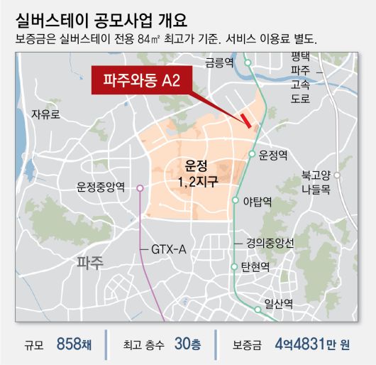 먼저 파주시 등 한국토지주택공사(LH)가 보유한 택지 2곳에 실버스테이 1300여 채를 공급한다. 이달 23일까지 참가의향서를 받고 심사를 진행해 6월까지 우선협상대상자를 선정할 계획이다.