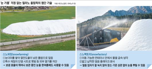 이런 자신감의 근거는 두 가지 첨단 기술 덕분에 가능하다. 농사 지은 곡물을 비축하듯 눈을 저장하는 ‘스노파밍(snowfarming)’ 기술과 공장처럼 손쉽게 눈을 만들어내는 ‘스노팩토리(snowfactory)’ 기술이다.