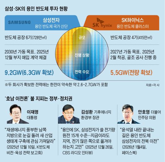 정부는 중심을 잡기는커녕 ‘호남 이전론’을 되레 부추기는 모습이다. 이재명 대통령은 지난달 10일 ‘K반도체 비전과 육성 전략 보고회’에서 “재생에너지가 풍부한 남쪽 지방으로 눈길을 돌려서 그 지역에서 새로운 산업 생태계를 구축하는 데 관심을 가져달라”고 했다. 2주쯤 뒤인 지난달 26일엔 김성환 기후에너지환경부 장관이 “용인에 SK, 삼성전자가 쓸 전기량이 원전 15개 수준인데 꼭 거기에 있어야 할지, 지금이라도 지역, 전기 많은 쪽으로 옮겨야 하는지 고민”이라고 말해 파장이 일었다. 용인 클러스터의 경우 막대한 전력 조달이 관건인데, 그 열쇠를 쥔 대통령과 기후부 장관이 전력 문제 해법을 찾는 대신 이를 빌미로 반도체 전쟁의 최전선에 선 기업들의 발목을 잡는 형국이다. 이런 분위기 속에 전북 등 지역 정치권이 가세한 것이다.