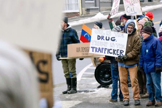 [브래틀버러=AP/뉴시스] 4일(현지 시간) 미 버몬트주 브래틀버러에서 손팻말을 든 시위대가 이 베네수엘라에 대한 미국의 공격에 항의하는 시위를 하고 있다. 2026.01.05. |