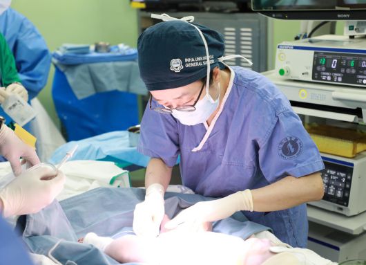 최윤미 인하대병원 소아외과 교수가 히르슈슈프룽병 치료를 위해 복강경 수술을 진행하고 있다. 인하대병원 제공 |