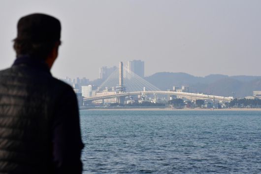 5일 경북 포항시 북구 해변에서 한 시민이 해오름대교를 바라보고 있다. 송도해수욕장과 영일대해수욕장을 연결하는 이 다리는 막바지 공사가 한창이다. 포항시는 6월 정상 개통할 예정이며, 이달 임시 개통 여부를 검토하고 있다. 뉴스1 Copyright Ⓒ 동아일보. All rights reserved. 무단 전재, 재배포 및 AI학습 이용 금지