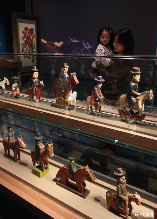 5일 오전 서울 종로구 국립민속박물관에서 열린 2026년 병오년 말띠 해 특별전 ‘말들이 많네―우리 일상 속 말’ 전시장에서 한 가족이 나무로 만든 ‘꼭두’ 인형 전시물을 관람하고 있다. 말에 담긴 다양한 문화와 상징, 사람과 말의 관계를 소개하는 이번 전시는 3월 2일까지 열린다.