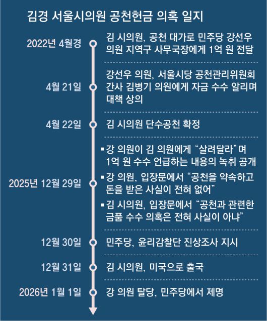 더불어민주당에서 제명된 강선우 의원에게 공천 헌금 1억 원을 전달했다는 의혹을 받고 있는 김경 서울시의원이 관련 의혹 제기 직후 미국으로 출국한 사실이 뒤늦게 알려졌다. 해당 의혹으로 고발당한 강 의원과 민주당 김병기 전 원내대표가 혐의를 전면 부인하는 상황에서 핵심 당사자인 김 시의원에 대한 조사가 지연되며 경찰의 수사는 차질을 빚을 수밖에 없게 됐다.