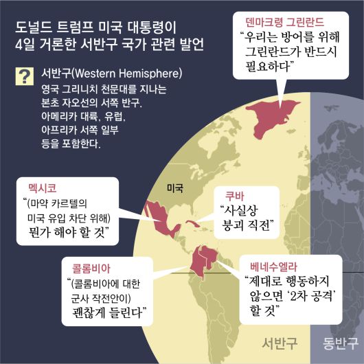 니콜라스 마두로 베네수엘라 대통령을 축출한 도널드 트럼프 미국 대통령이 4일(현지 시간) 콜롬비아, 쿠바, 멕시코, 덴마크령 그린란드 등 서반구 여러 나라를 동시에 정조준하며 ‘돈로 독트린(Don-roe Doctrine)’ 의지를 본격화했다. 돈로 독트린은 트럼프 대통령의 이름 ‘도널드’와 19세기 당시 아메리카 대륙에서 미국 패권을 강조한 제임스 먼로 전 대통령(1817∼1825년 재임)의 외교 정책 ‘먼로 독트린’을 합성한 단어다. 중국과 러시아의 서반구 영향력을 억제하고 이 지역에서 미국의 단일 패권을 회복하겠다는 트럼프 대통령의 의지가 돈로 독트린에 담겨 있다. 트럼프 행정부는 지난해 12월 4일 공개한 국가안보전략(NSS)에서도 서반구에서의 영향력 확대를 중요한 과제로 언급했다.