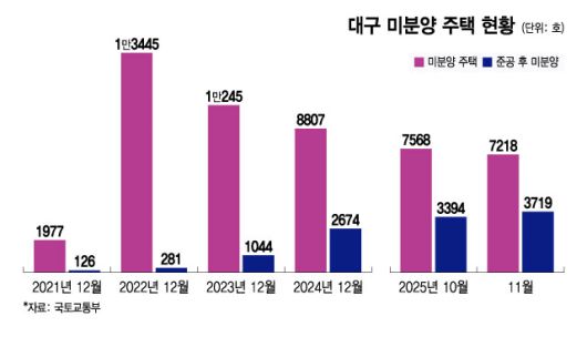 이 같은 통계적 착시는 준공 후 미분양 지표에서 더욱 뚜렷하게 드러난다. 2025년 11월 기준 대구의 준공 후 미분양은 3719가구로 집계됐다. 2021년 12월 126가구에 불과했던 준공 후 미분양은 2022년 12월 281가구, 2023년 12월 1044가구로 늘었고, 2024년 12월에는 2674가구까지 증가했다. 4년 만에 약 30배 가까이 불어난 셈이다.