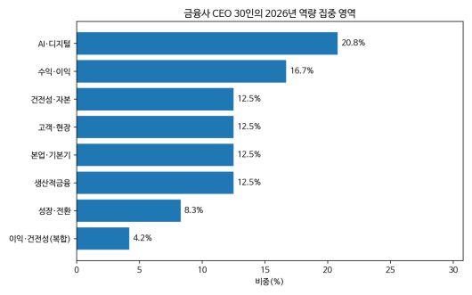 5일 본지가 은행·보험·카드·저축은행 등 금융권 최고경영자(CEO) 30인을 대상으로 진행한 설문조사에 따르면, CEO들은 ‘올해 회사의 역량을 집중할 최우선 분야’로 ‘AI·디지털(20.8%)’을 꼽았다. 이는 전통적인 경영 목표인 ‘수익·이익(16.7%)’보다 높은 응답률을 기록한 항목으로, CEO 5명 중 1명은 올해 경영의 중점을 AI 및 디지털 역량 강화에 두고 있는 것으로 나타났다.