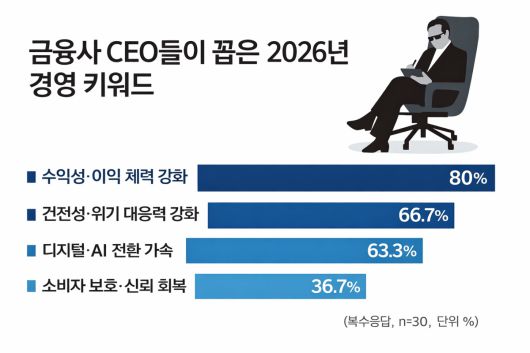5일 본지가 은행·보험·카드·저축은행 등 금융권 CEO 30인을 대상으로 설문조사를 실시한 결과(복수응답) 올해 경영의 최우선 과제로는 이익 체력 강화(80.0%)가 가장 많이 꼽혔다. 이어 위기 대응력 강화(66.7%)였다. 수익을 얼마나 더 늘릴 수 있느냐보다, 변동성 국면에서도 흔들리지 않는 지속 가능한 수익 구조를 갖추는 것이 더 시급하다는 인식이 금융권 전반에 공유되고 있음을 보여준다.