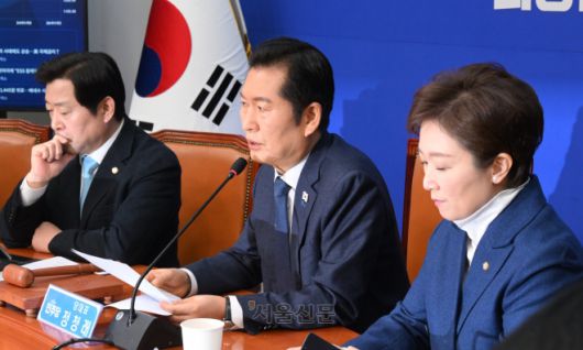 정청래 더불어민주당 대표가 5일 국회에서 열린 최고위원회의에서 발언하고 있다. 왼쪽부터 황명선 최고위원, 정 대표, 이언주 최고위원. 안주영 전문기자 |
