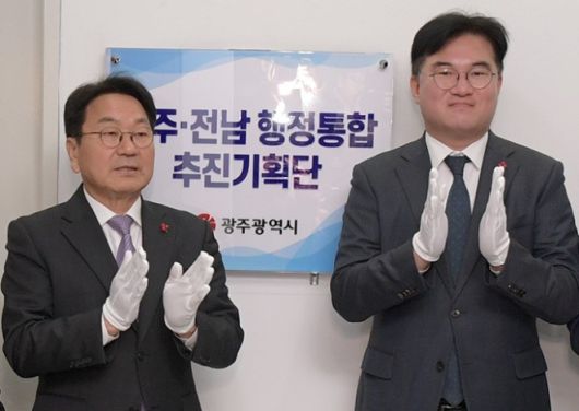 광주시와 전남도는 5일 각각 행정통합 추진기획단 현판식과 실무회의를 여는 등 지방선거에서 통합 광역단체장을 선출하기 위한 법적 절차 마련에 돌입했다.