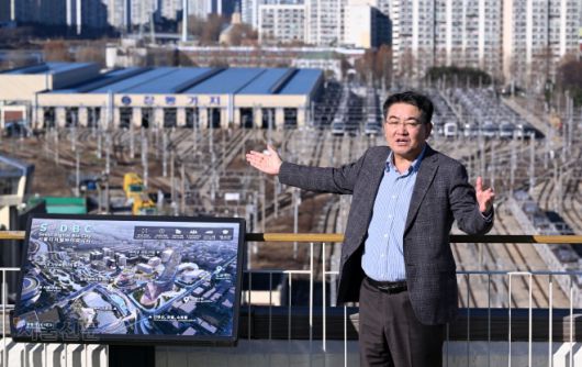 오승록 서울 노원구청장이 5일 구청 옥상에서 창동차량기지를 배경으로 ‘서울디지털바이오시티’(S-DBC) 추진 방향에 대해 설명하고 있다. 창동차량기지는 오는 6월 남양주 진접으로 이전한다. 도준석 전문기자 |