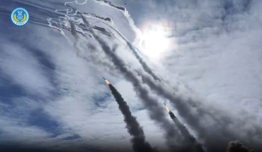 지난해 12월 30일 중국이 본토의 푸젠성에서 발사한 로켓포탄이 대만 북부와 남서부 해상의 목표 지점을 타격하는 모습. 중국군 동부 전구는 드론을 배치해 탄착 상황을 촬영했다고 밝혔다. 중국 국방부 홈페이지 캡처 |