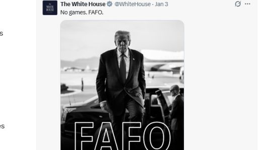 백악관은 마두로 체포 작전이 전개된 지난 3일(현지시간), 공식 엑스(X)와 인스타그램 계정에 도널드 트럼프 대통령이 결연한 표정으로 계단을 오르는 흑백 사진을 게시했다. 사진 하단에는 'FAFO'라는 문구가 큼직하게 새겨졌다.
