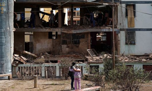 미국의 베네수엘라 공습으로 니콜라스 마두로 대통령과 부인 실리아 플로레스가 체포된 뒤 4일(현지시각) 베네수엘라 카티아 라 마르의 파손된 건물 밖에서 두 여성이 내부의 잔해를 살펴보는 사람들을 바라보고 있다. 카티아 라 마르/로이터 연합뉴스 |