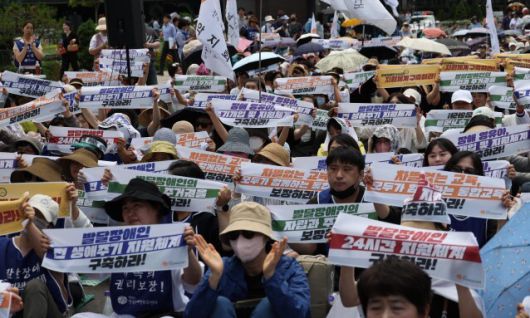 지난 2023년 4월20일 서울 용산구 삼각지역 인근에서 열린 4·20 장애인차별철폐 투쟁결의대회 참가자들이 손팻말을 들고 있다. 김혜윤 기자 unique@hani.co.kr |