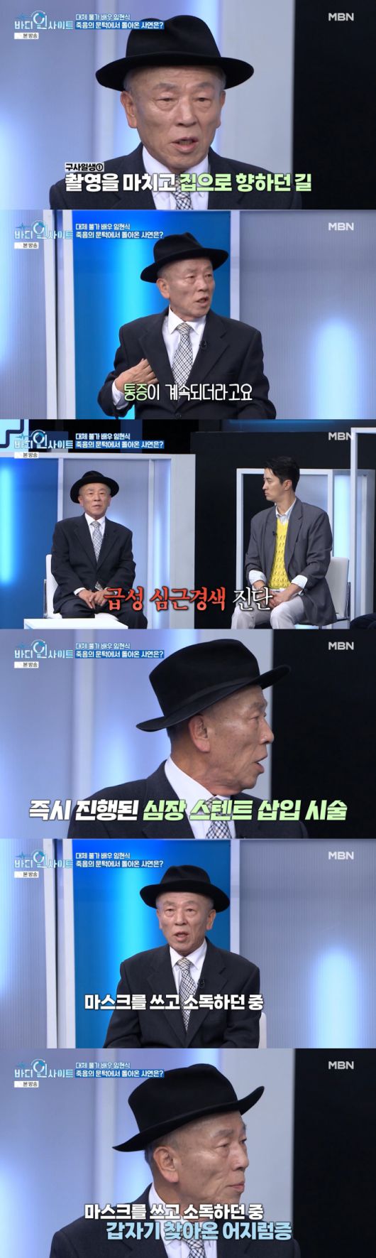임현식은 생사를 넘나들었던 당시를 떠올리며 "죽다 살아났다기 보다, 죽다시피 했다가 살았다"라며 말문을 열었다. 이어 "촬영을 마치고 귀가하던 중, 가슴 통증이 왔다. 이런 통증을 몇 번 느꼈는데, 그날도 통증을 느꼈다. 집에 아무도 없고 혼자여서 바로 응급실로 갔다. 급성 심근경색 진단을 받아 심장 스텐트 삽입 시술을 했다"라며 아찔했던 경험을 떠올렸다.