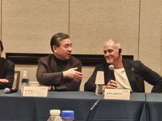 (왼쪽부터)장재훈 현대차그룹 부회장과 로버트 플레이터 보스턴다이나믹스 최고경영자가 이야기를 나누고 있다. 사진=김다정 기자 |