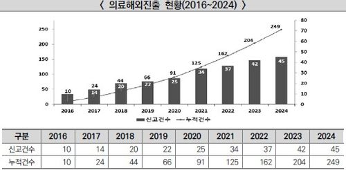 6일 한국보건산업진흥원에 따르면 의료 해외 진출 및 외국인 환자 유치 지원에 관한 법률(의료해외진출법)이 시행된 2016년부터 2024년까지 의료 해외 진출 누적 신고 건수는 총 249건이다.