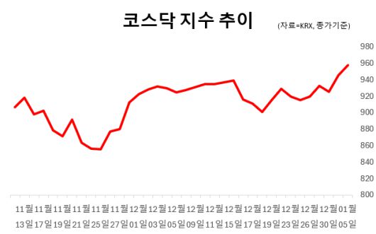 6일 한국거래소(KRX)에 따르면 전일 코스닥 지수는 전 거래일 대비 1.26%(11.93포인트) 오른 957.5에 거래를 마쳤다. 개인과 기관이 각각 976억원, 242억원 매수우위를 보였다. 다만 외국인은 1120억원 매도우위를 기록했다.