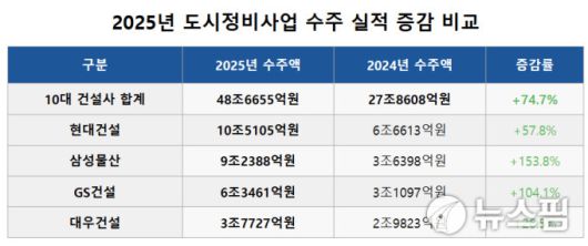 지난해 도시정비사업 수주 실적은 대형 건설사 중심으로 역대급 기록을 남겼다. 시공능력평가액 기준 상위 10개 건설사의 지난해 정비사업 수주 총액은 약 48조7000억원으로 추산된다. 역대 최고치를 기록했던 2022년(42조936억원)과 비교해도 16% 이상 많다.