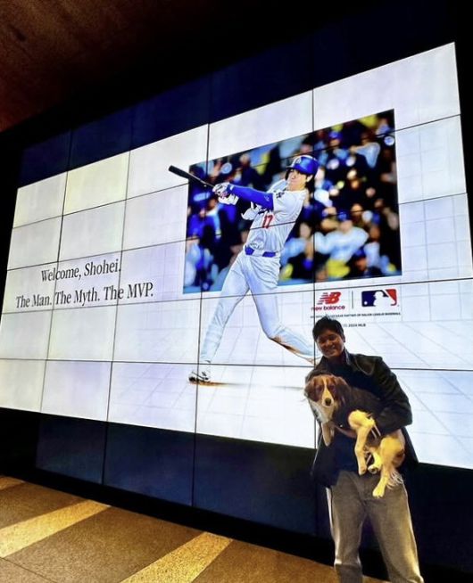 LA 다저스의 오타니 쇼헤이가 자신의 반려견 데코핀을 안고 웃고 있다. 오타니 인스타그램 캡처 |