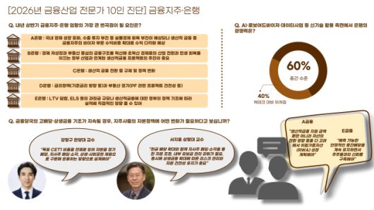 6일 이코노믹데일리가 국내 주요 금융 전문가와 금융기관을 대상으로 진행한 '2026년 상반기 금융지주·은행 업황 전망' 설문 조사 결과에 따르면 금융기관과 전문가들은 공통적으로 비이자이익 강화와 디지털·AI 경쟁력 및 전문 인재 확보를 내년 업황의 핵심 변수로 지목했다.
